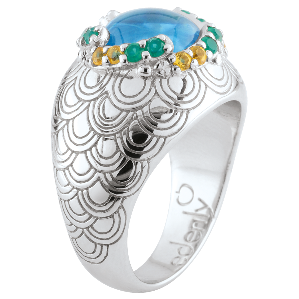 - Harmonieuze combinatie van edelstenen: blauwe topaas, citrien en groene agaat.