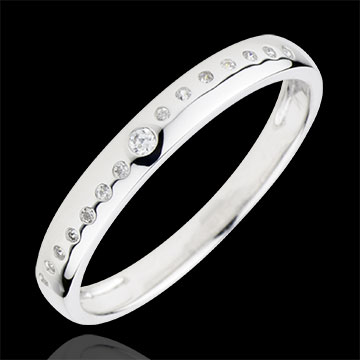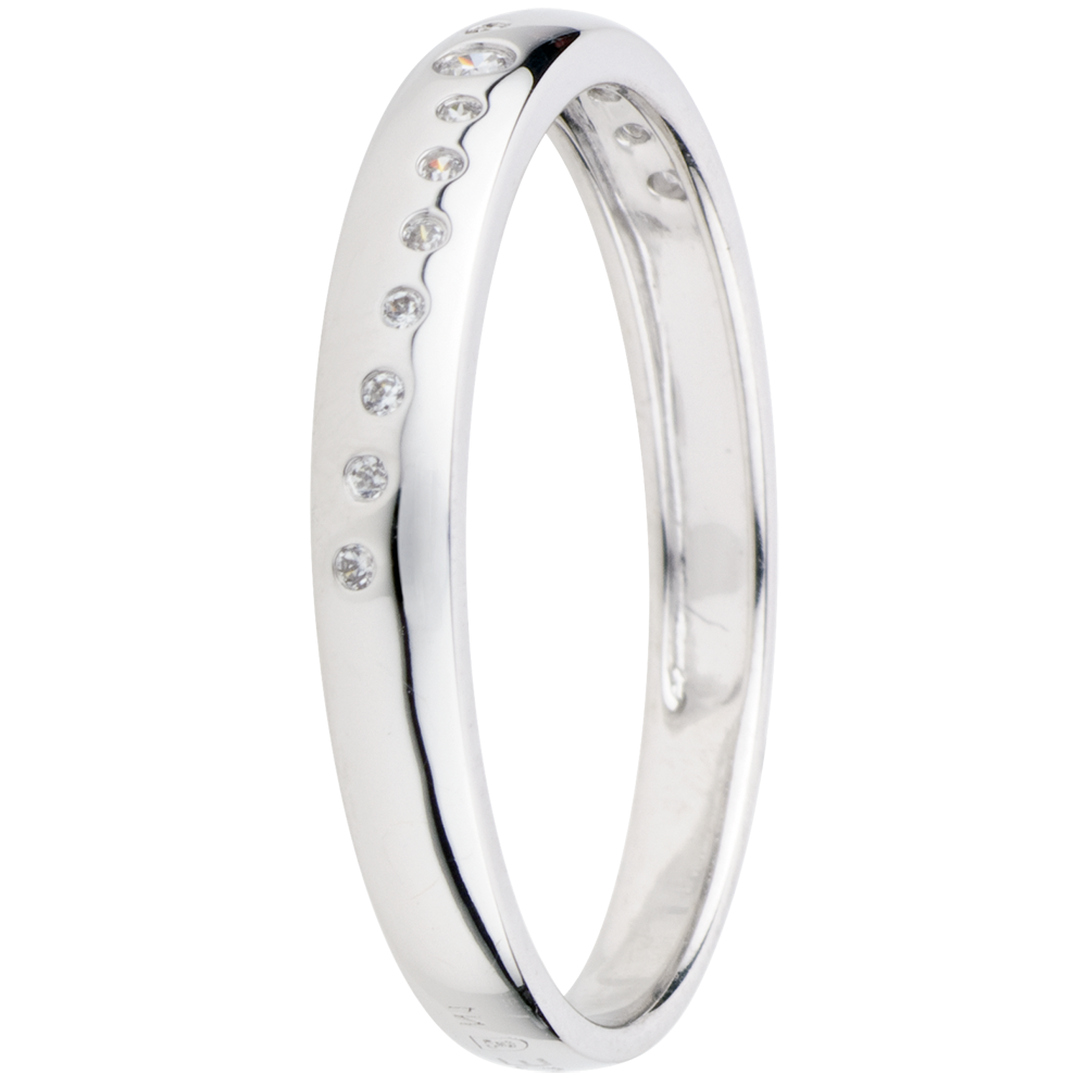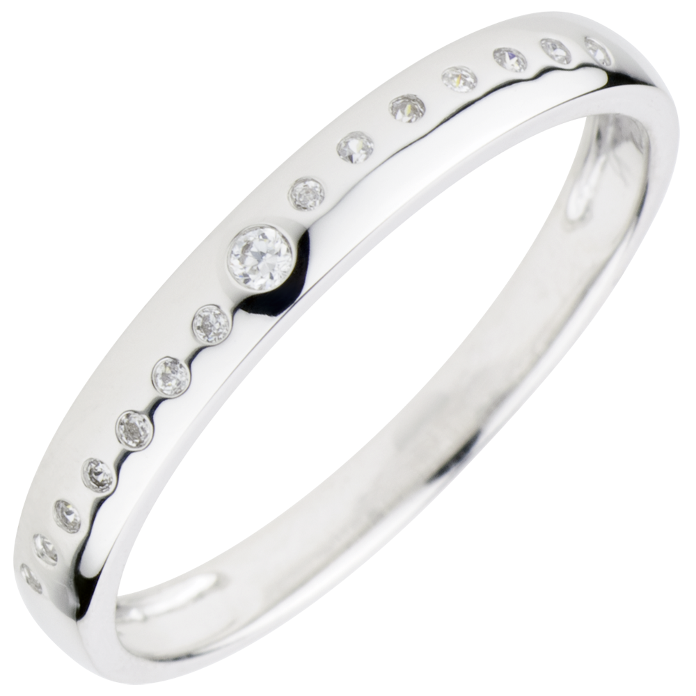 Een golf van diamanten ondersteund door witgoud met in het midden een diamant van 0.015 karaat.