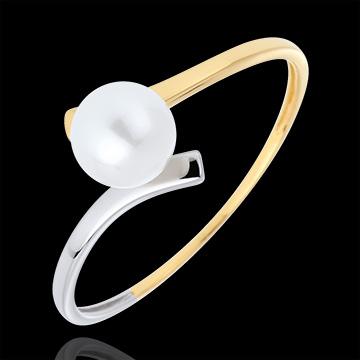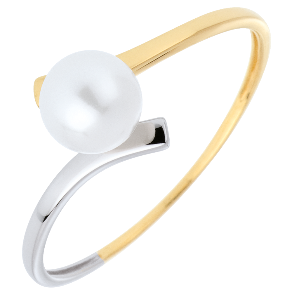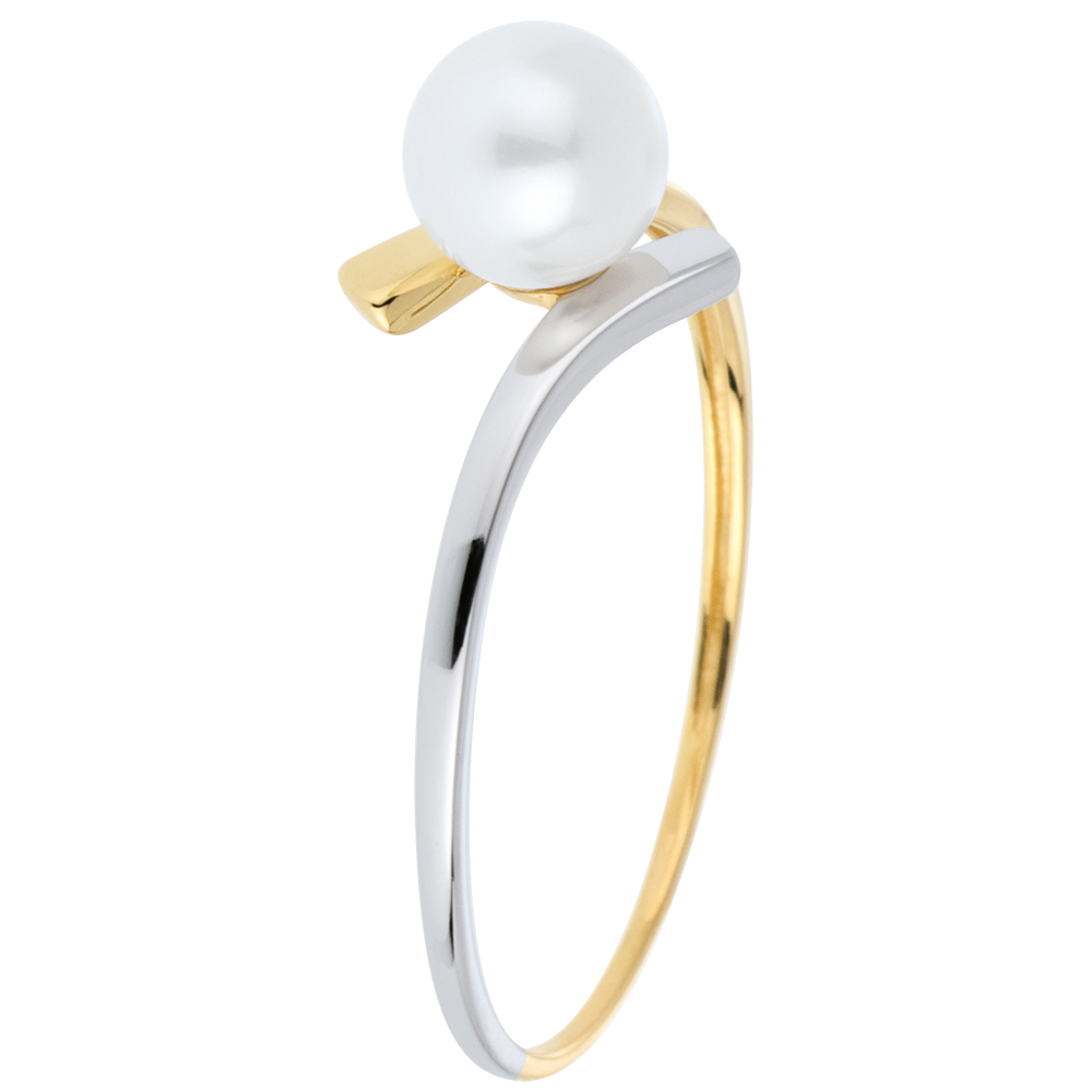 Een beweging van tweekleurig goud bekroont delicaat de zoetwaterparel. Zoetwater parel van 5 mm diameter.