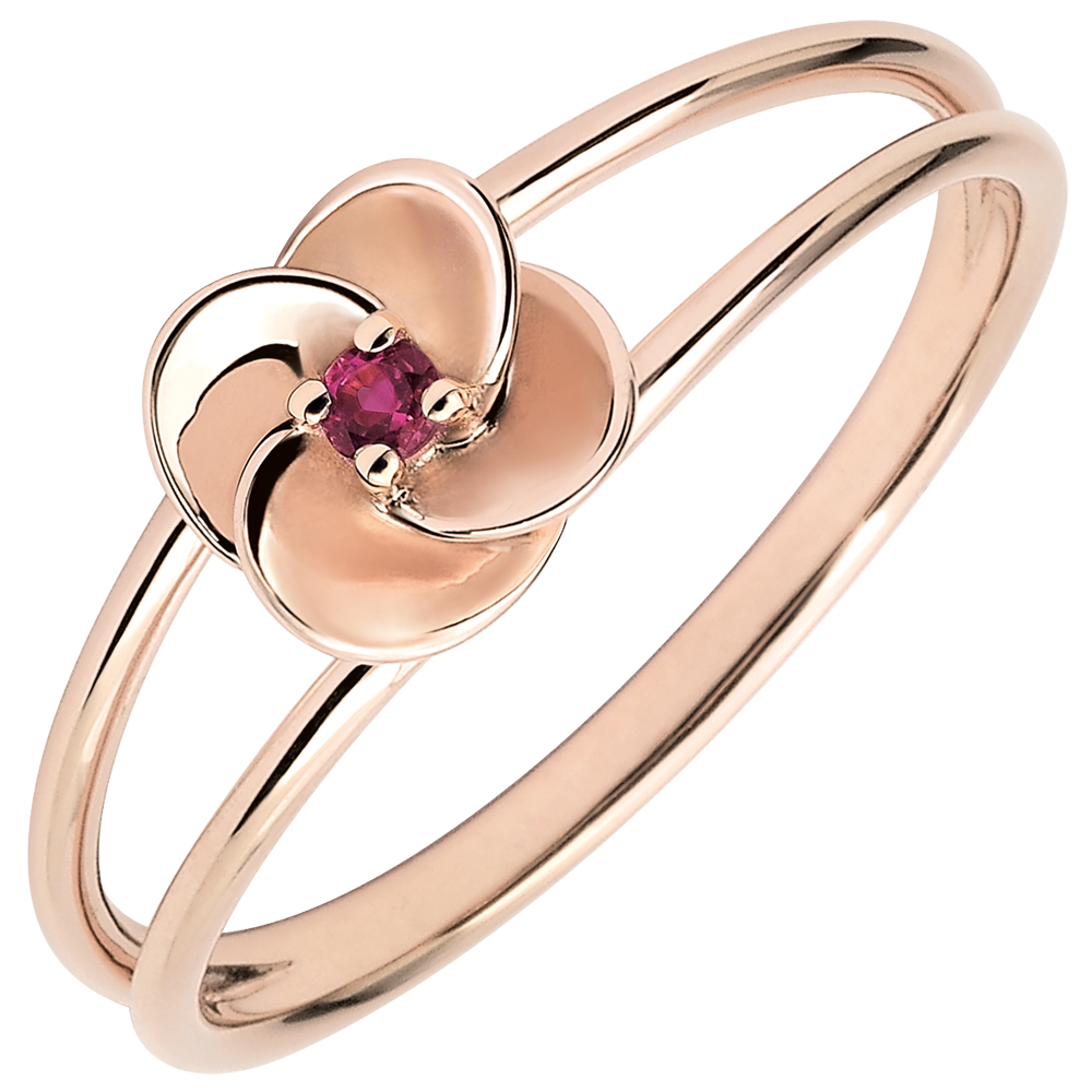 De bloemblaadjes van deze kleine roos in roségoud zijn geopend op een robijn hart voor de eeuwigheid.
