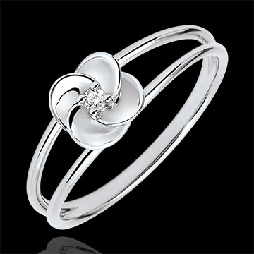 De bloemblaadjes van deze kleine roos in witgoud zijn geopend op een diamanten hart voor de eeuwigheid.
