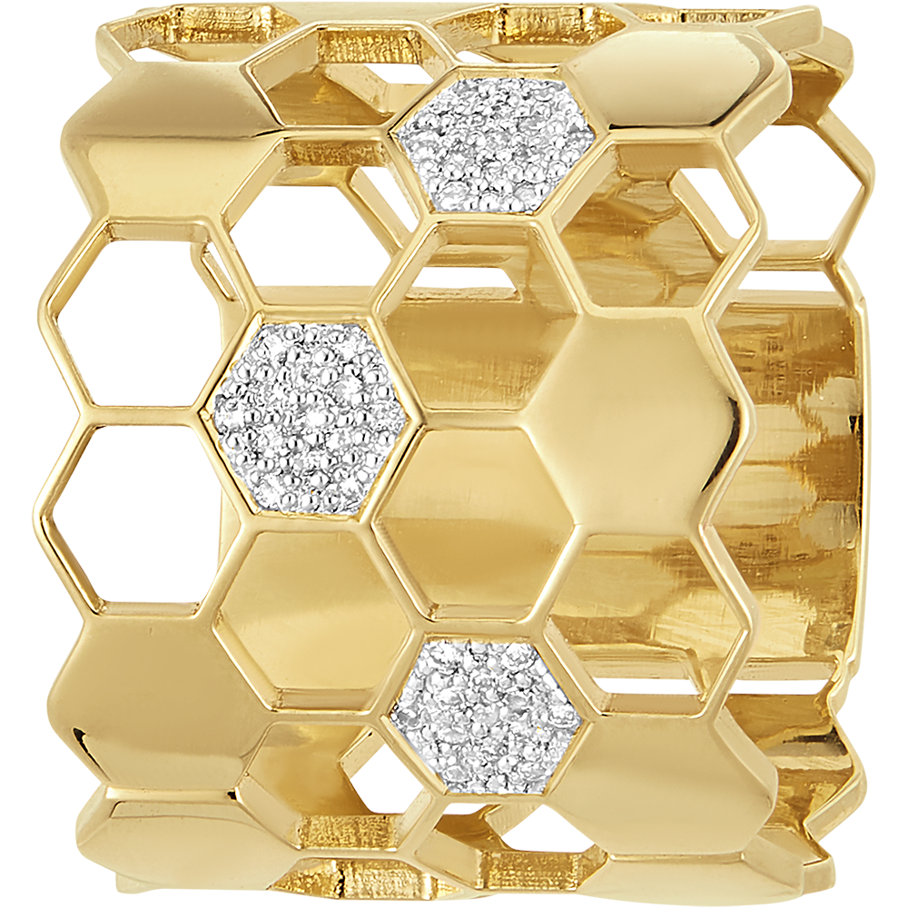 Laat u verleiden door de delicate schoonheid van de Maxi Openbaring ring, een unieke en tijdloze creatie geïnspireerd door het kostbare werk van bijen. Bestaande uit 4 rijen perfect gevormde gouden honingraatcellen, is dit stuk versierd met 15 volle cellen en 3 subtiel gezette cellen met 39 schitterende diamanten.