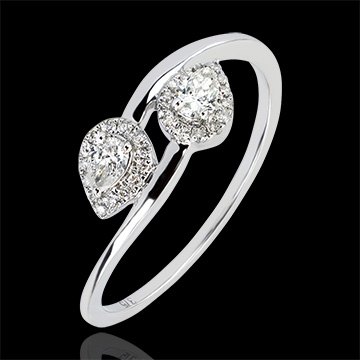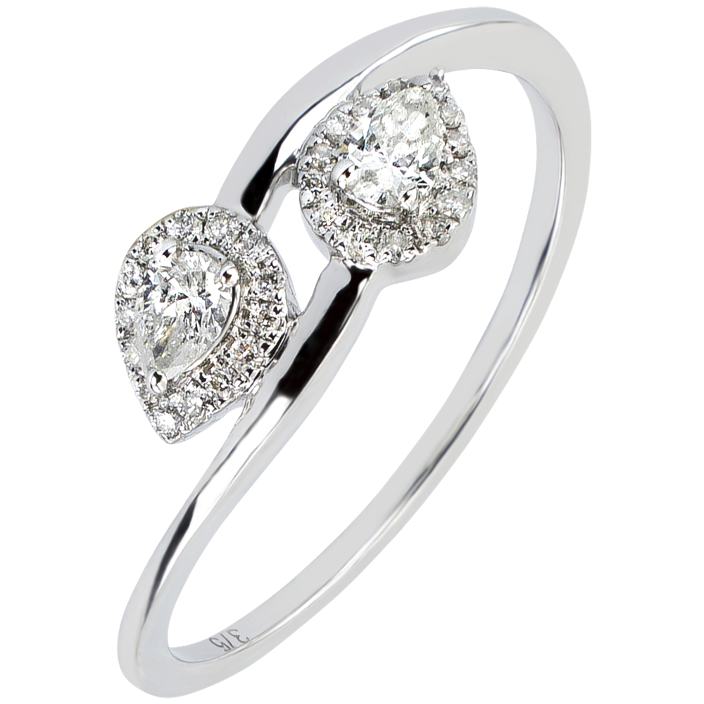 De symmetrische weerkaatsing van twee peer-diamanten, omgeven door een ring van diamanten, voor een symbolische, vrouwelijke ring.