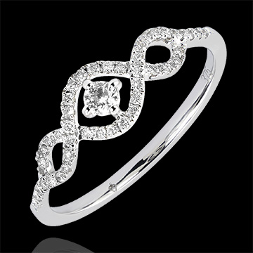 Een centrale diamant omarmd door voluten bezet met diamanten, een model dat vrouwelijkheid en delicatesse uitstraalt.