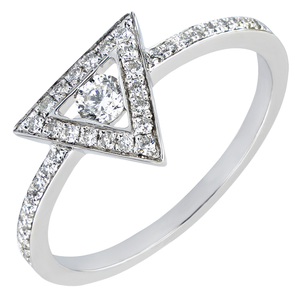 Een diamant genesteld in een met diamanten ingelegde driehoek, een grafische, moderne ring, symbool van evenwicht en sterke persoonlijkheid. Half betegelde ring