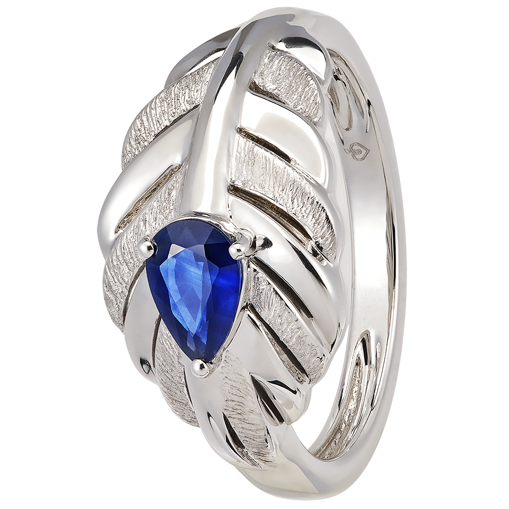 De Altesse-ring in 18 karaats witgoud benadrukt een centrale synthetische saffier van 0,45 karaat in peervorm. Zijn door veren geïnspireerde ontwerp belichaamt perfect de elegantie en verfijning van de Panache collectie.