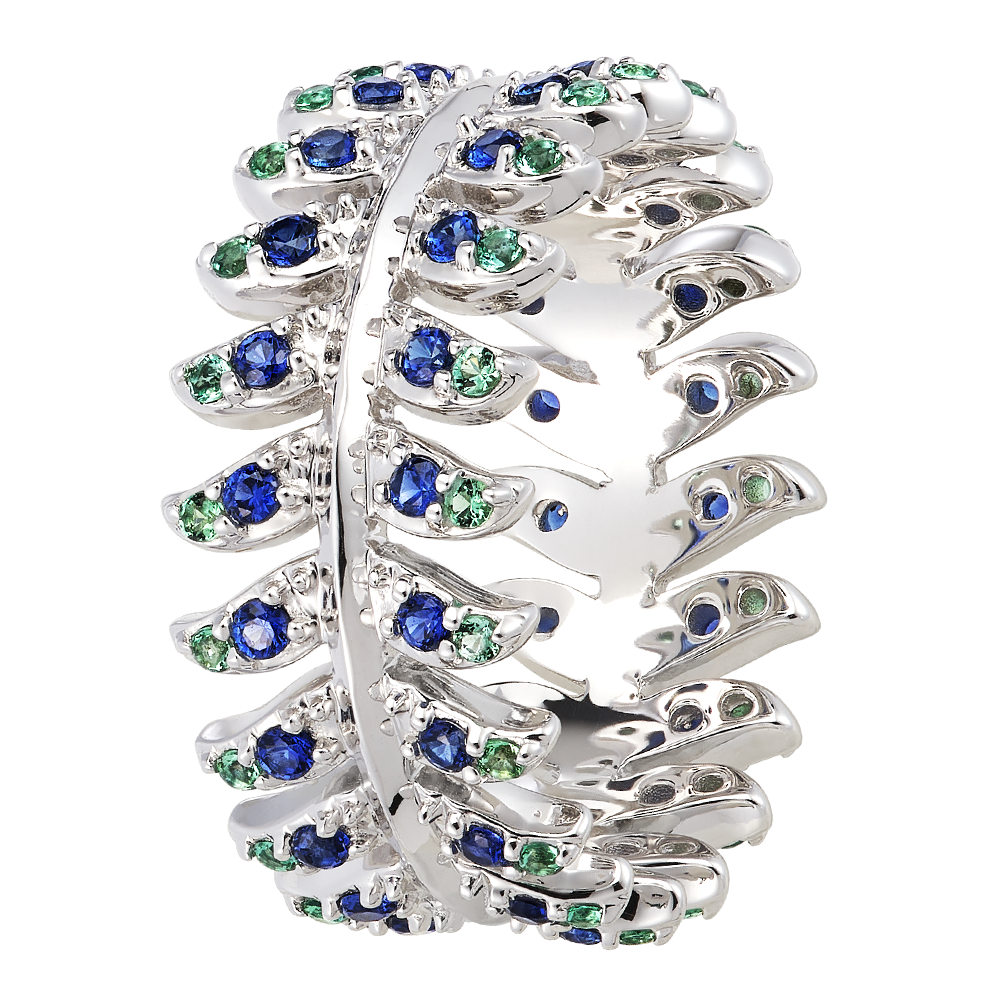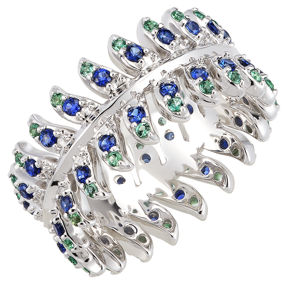 De eerbied ring in 9 karaats witgoud onderscheidt zich door zijn cirkelvormige veermotief, subtiel bezet met 80 synthetische smaragden en saffieren. Deze ring is in lijn met de majestueuze geest van de Panache collectie en is een voorbeeld van verfijning en glans, ideaal om een vleugje schittering aan uw hand toe te voegen.