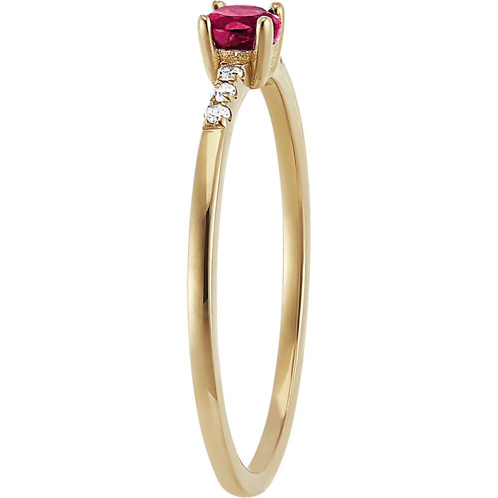 De waardering en de essentie van een robijn, sober geplaatst op een geelgouden ring bezet met 6 diamanten. Een klassiek, tijdloos sieraad met een vleugje kleur.