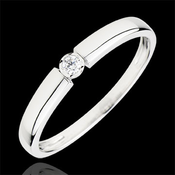 Diamant omringd door witgoud is ondersteund door een witgouden band voor een moderne solitaire met een optimaal draagcomfort.