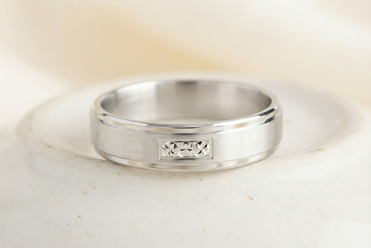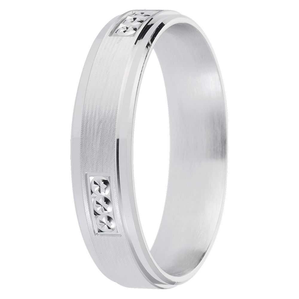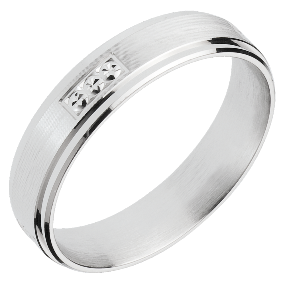 Een sobere en elegante trouwring benadrukt door delicate stempels.