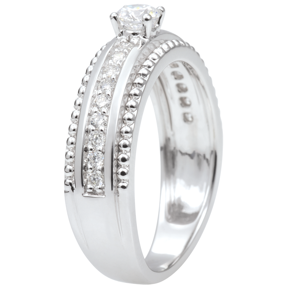 Een solitairee diamant wordt ondersteund door twee rijen van gouden parels die een diamanten ring omlijsten. Een ring die een schitterende en elegante vrouwelijkheid uitstraalt