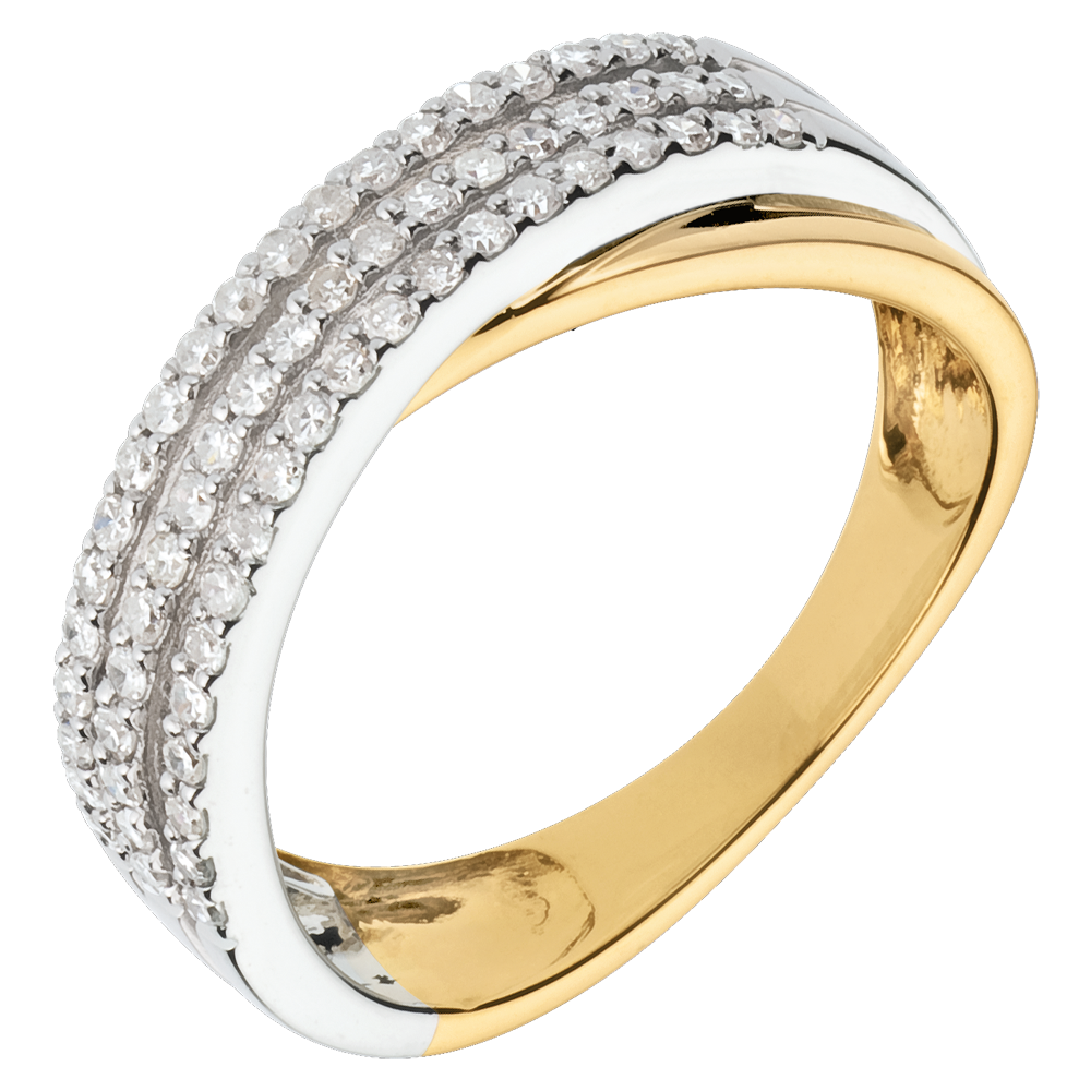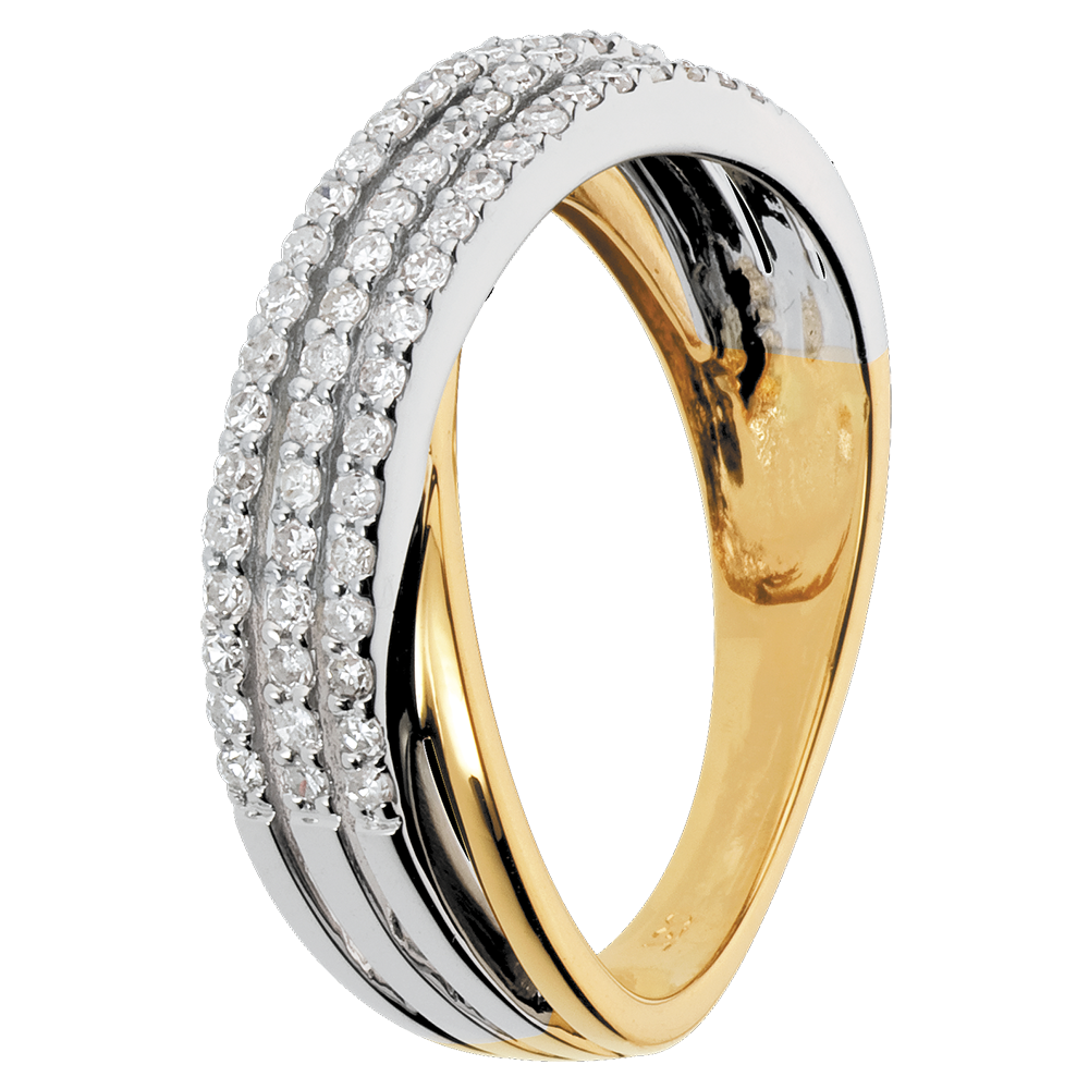 Een witgouden ring geplaveid met drie rijen van diamanten samen met een geelgouden ring voor een reis naar de sterren.