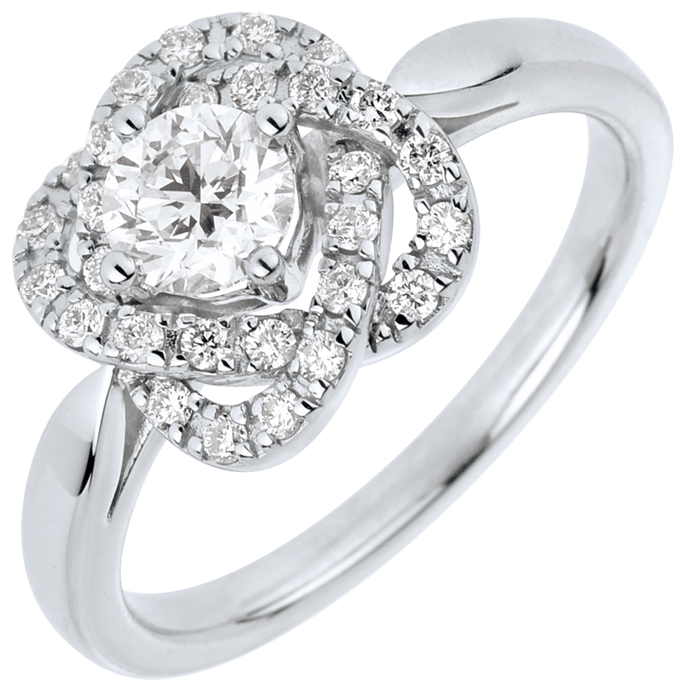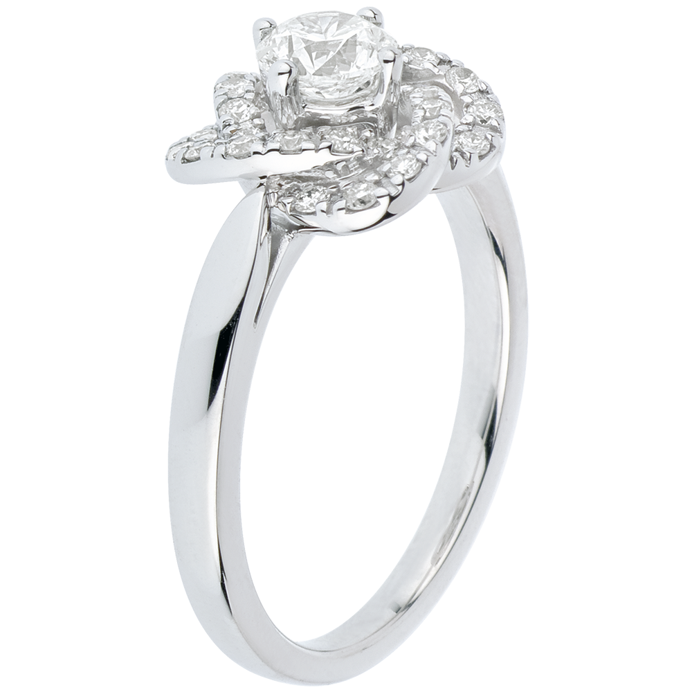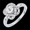 Een solitairee diamant in een wervelwind van diamanten bloemblaadjes en witgoud.
