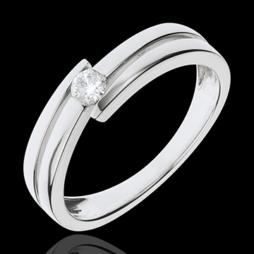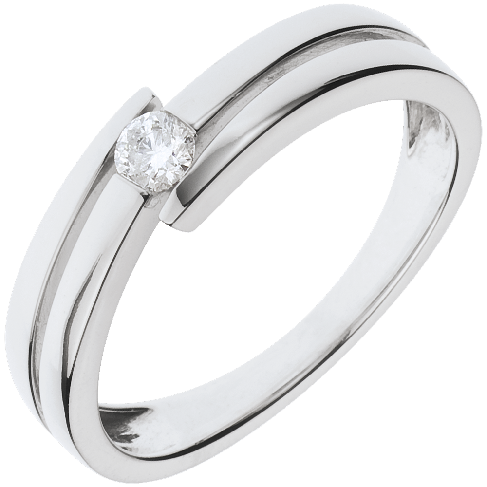 De witgouden ringen spelen met hun vorm die een symmetrische diamanten solitaire omlijsten