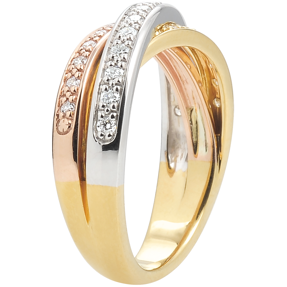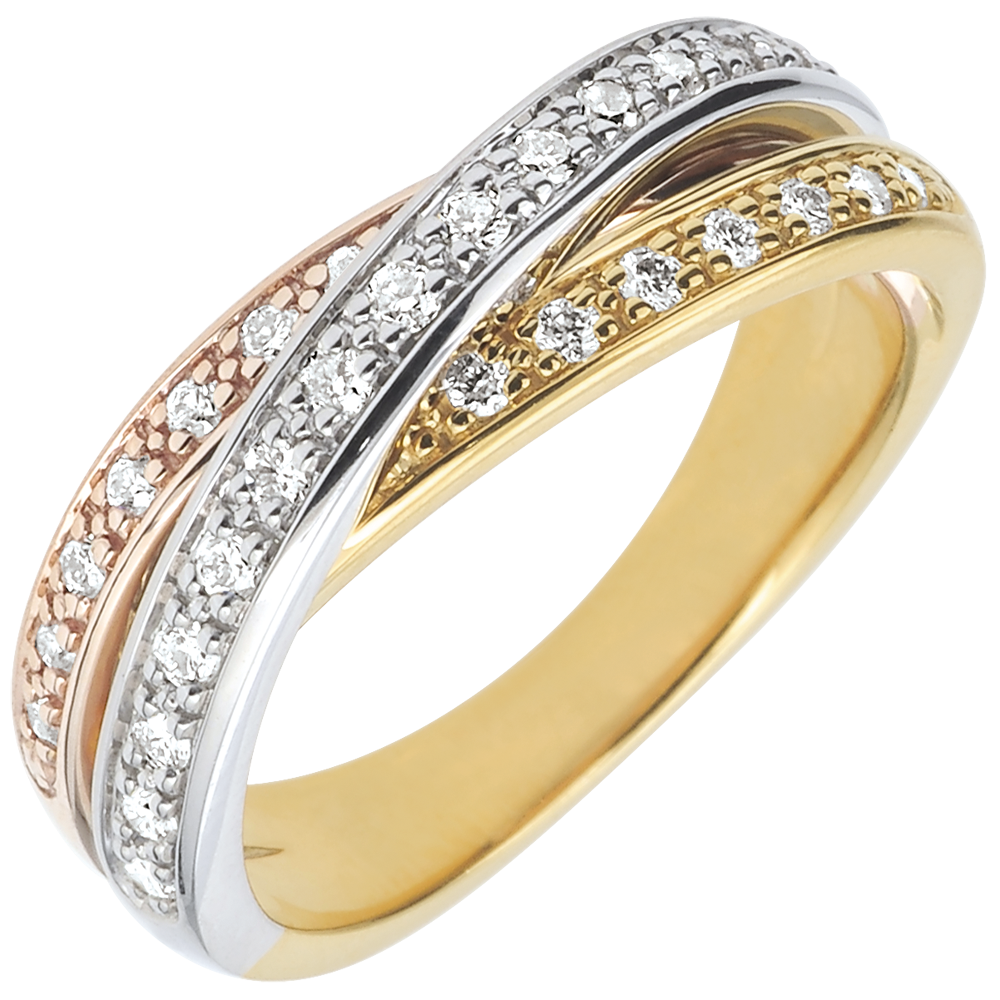 De ring is vervaardigd uit 18-karaats goud en combineert drie tinten: geel-, wit- en roségoud voor een harmonisch en origineel effect.