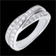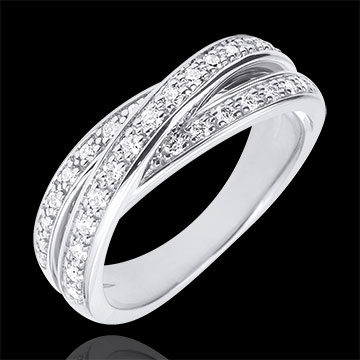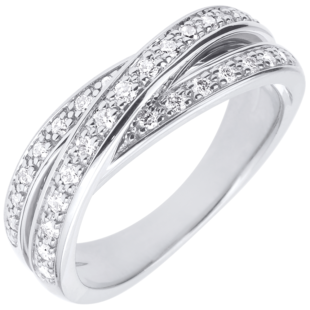 De uitgebalanceerde combinatie van drie ringen met een luxueuze diamanten pavézetting.Deze ring in witgoud en diamant kan zowel als trouwring of als uitzonderlijk geschenk.