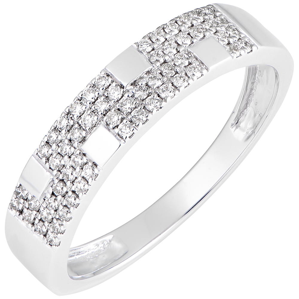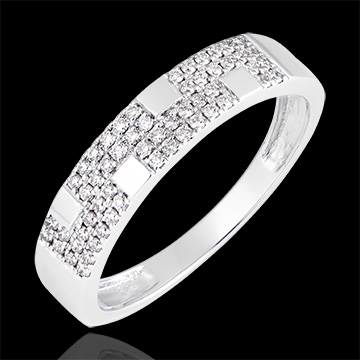 Een originele, grafische ring met een dubbele rij diamantbezetting benadrukt door witgouden vierkanten. Een man-vrouwmodel dat alleen of door beide partners gedragen kan worden.…
