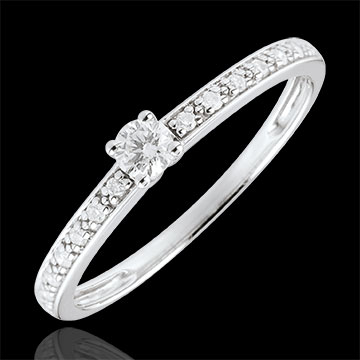 Een klassieke en elegante witgouden ring met diamanten gedragen door 4 pootjes en versierd met schitterende diamanten aan de zijkanten van het frame.