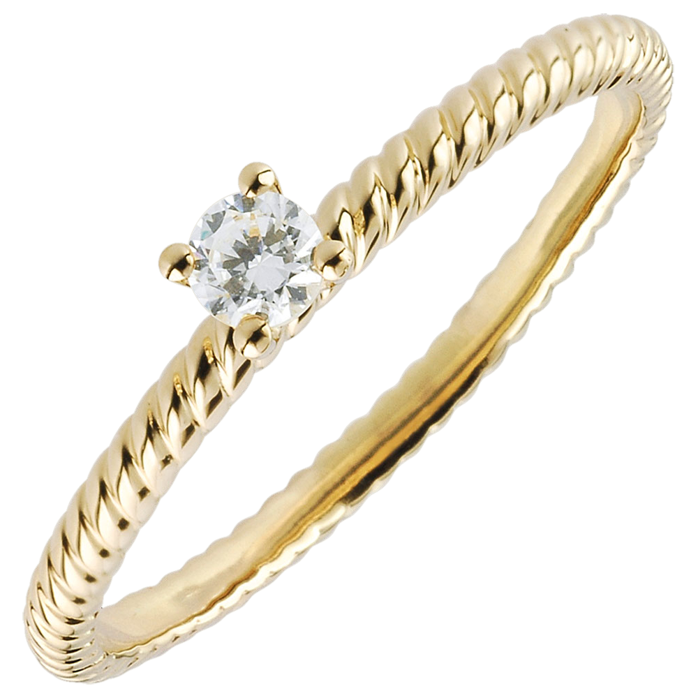 Een solitairee diamant in handen van vier pootjes en geplaatst op een kostbaar gouden touw. Originele en tijdloze verlovingsring.