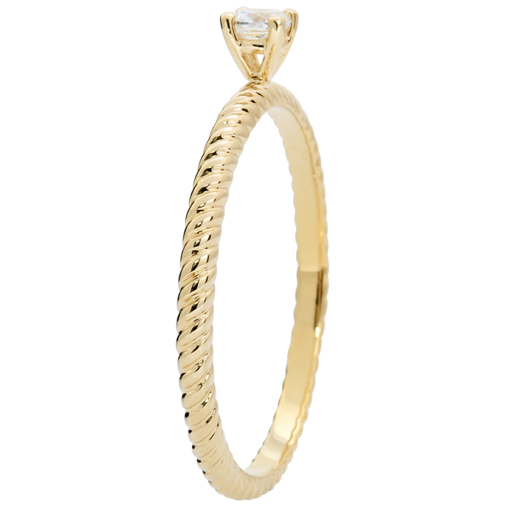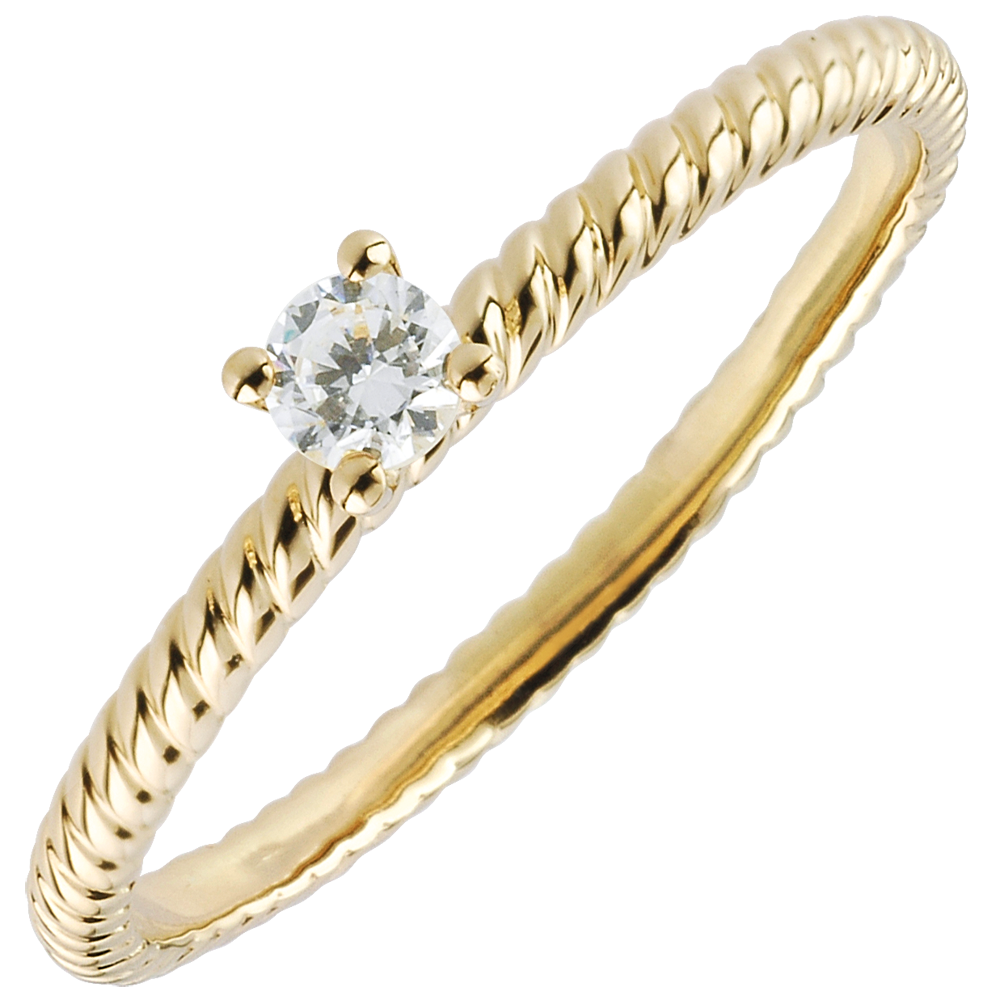 Een solitairee diamant in handen van vier pootjes en geplaatst op een kostbaar gouden touw. Originele en tijdloze verlovingsring.