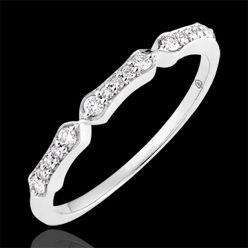 Een moderne, verfijnde ring bestaand uit drie bezette schakels. Een model dat als trouwring of gecombineerd met andere ringen gedragen wordt.