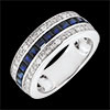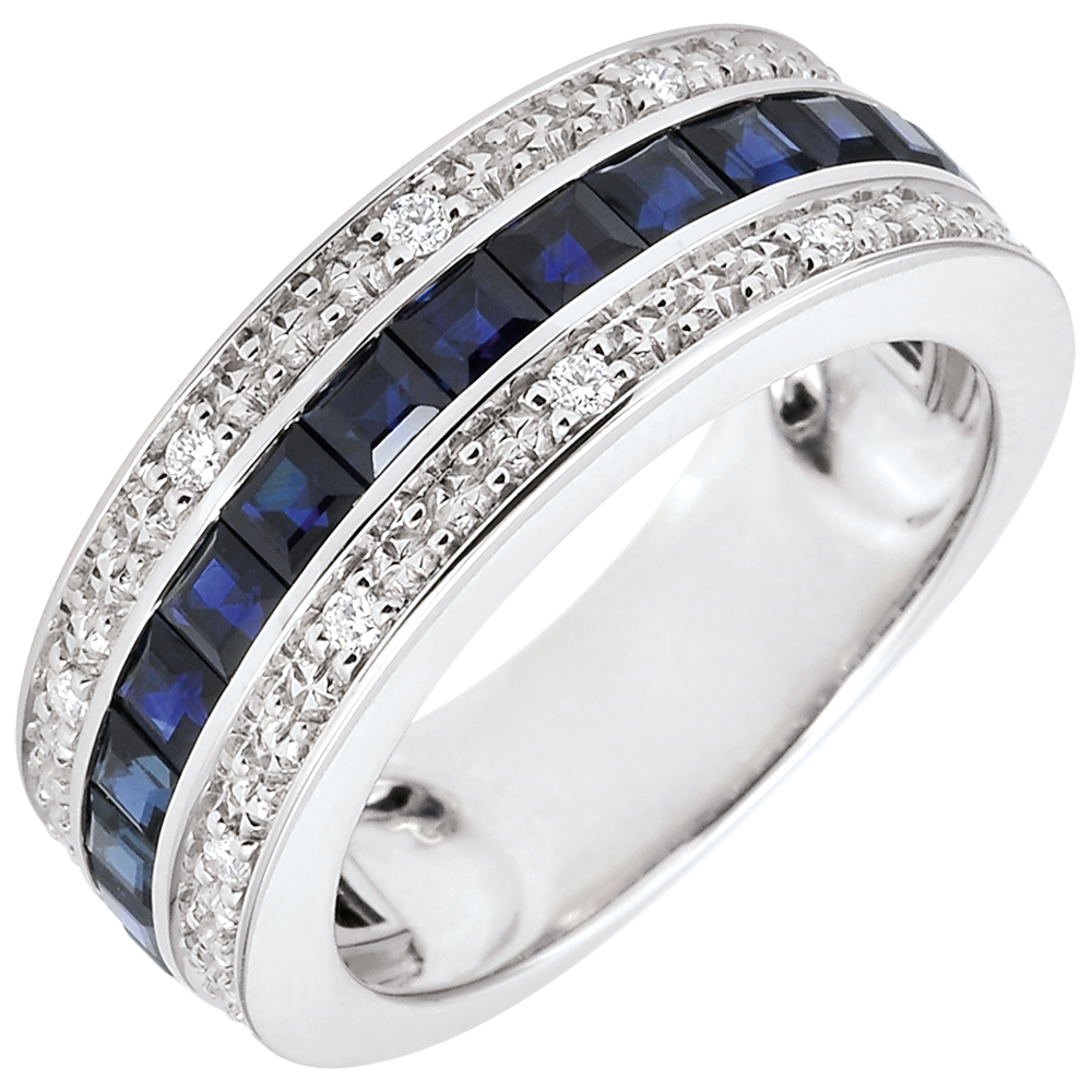 Een elegante witgouden ring waarvan de centrale blauwe Saffieren pavézetting wordt versterkt door twee rijen van diamanten en gouden bloemen.