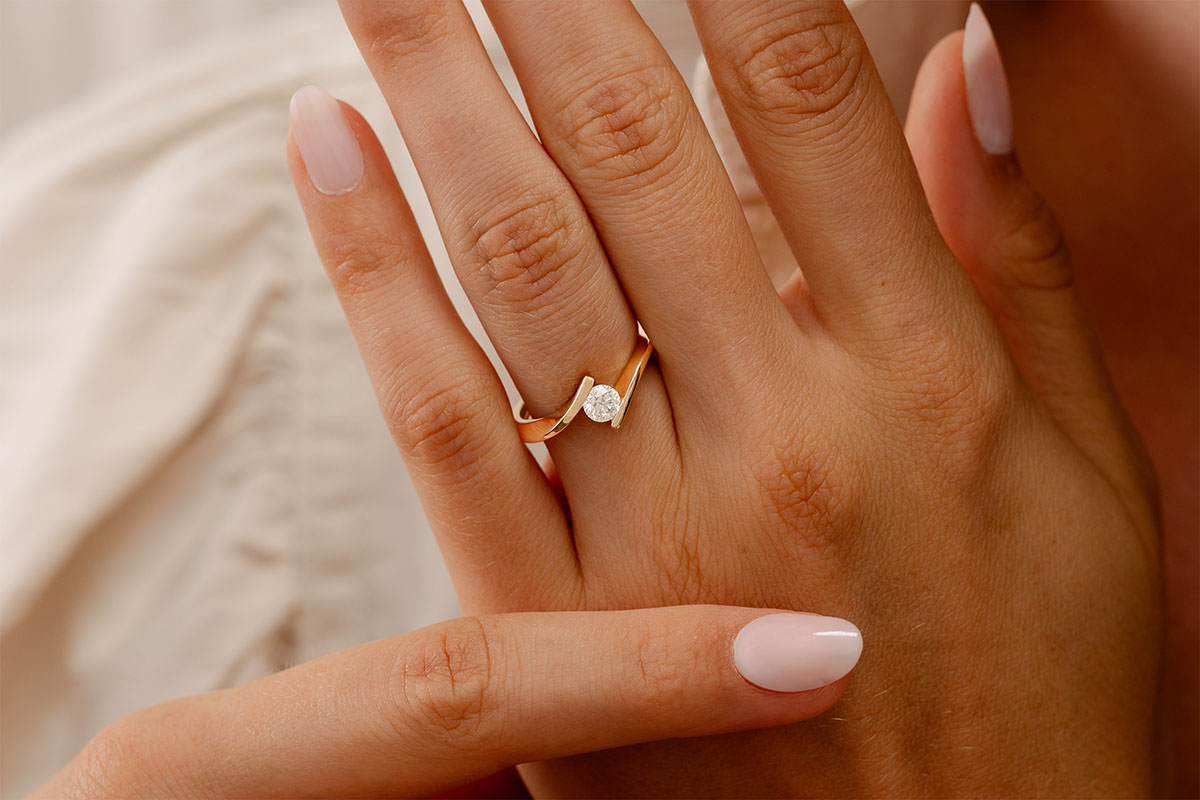 Een diamanten solitaire is gevlochten in een eenvoudig, modern frame.