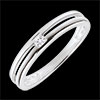Een geslepen diamant is ingeklemd door twee witgouden ringen.