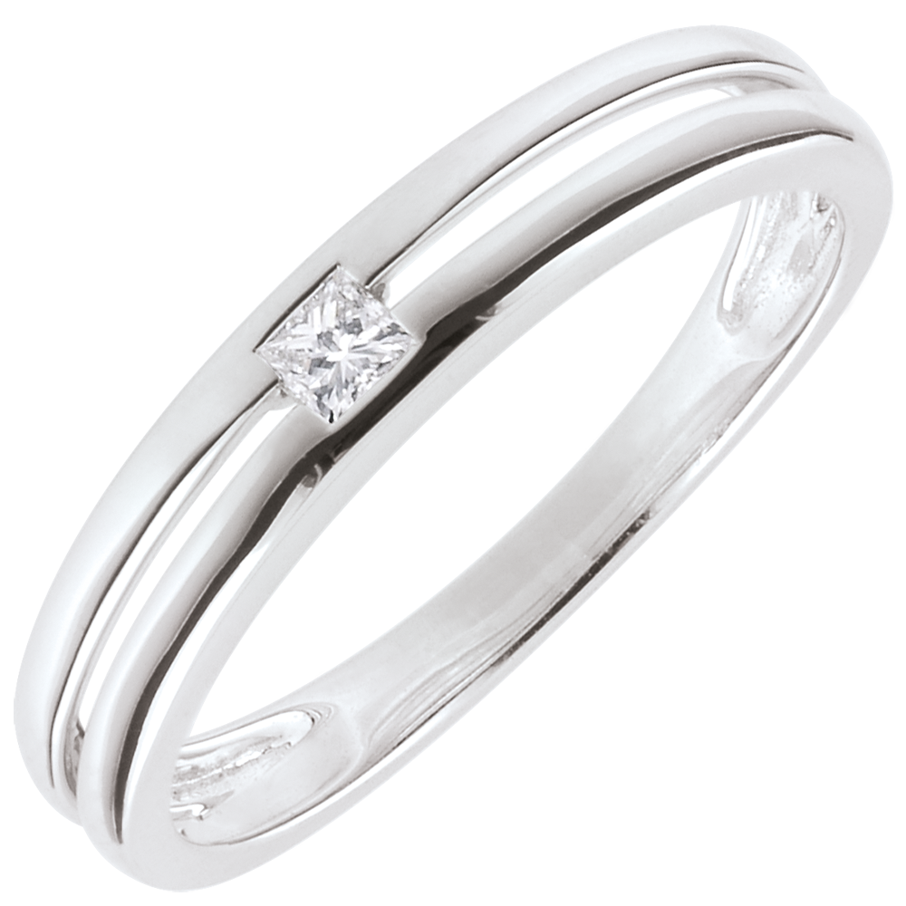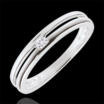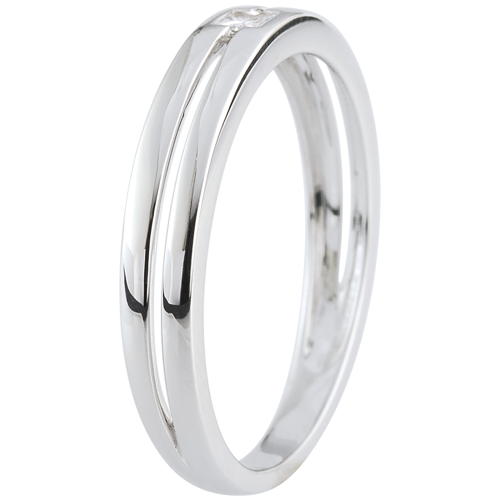 Een geslepen diamant is ingeklemd door twee witgouden ringen.