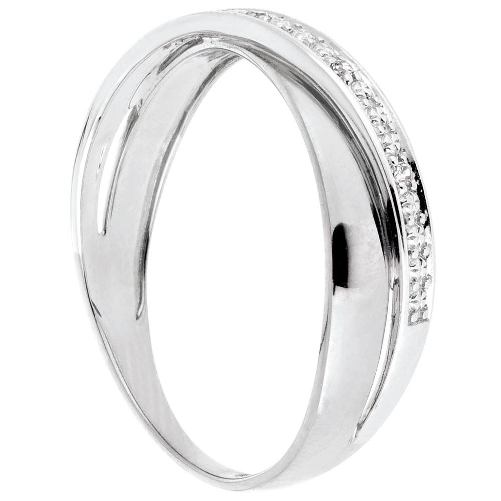Een witgouden ring gekruist met een witgouden ring bezet met glanzende geslepen diamanten.