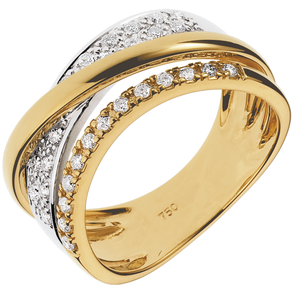 Twee ringen in geel en witgoud geplaveid met diamanten, verenigd door een roségouden ring voor een luxe reis op Saturnus.