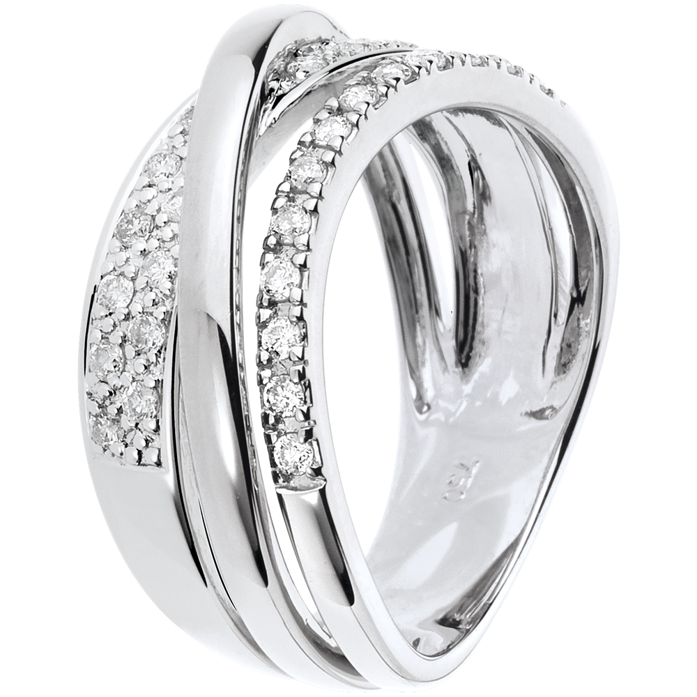 Twee witgouden ringen geplaveid met diamanten gaan samen met een geelgouden ring voor een luxe reis op Saturnus