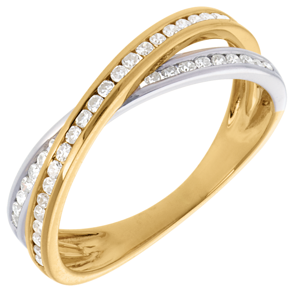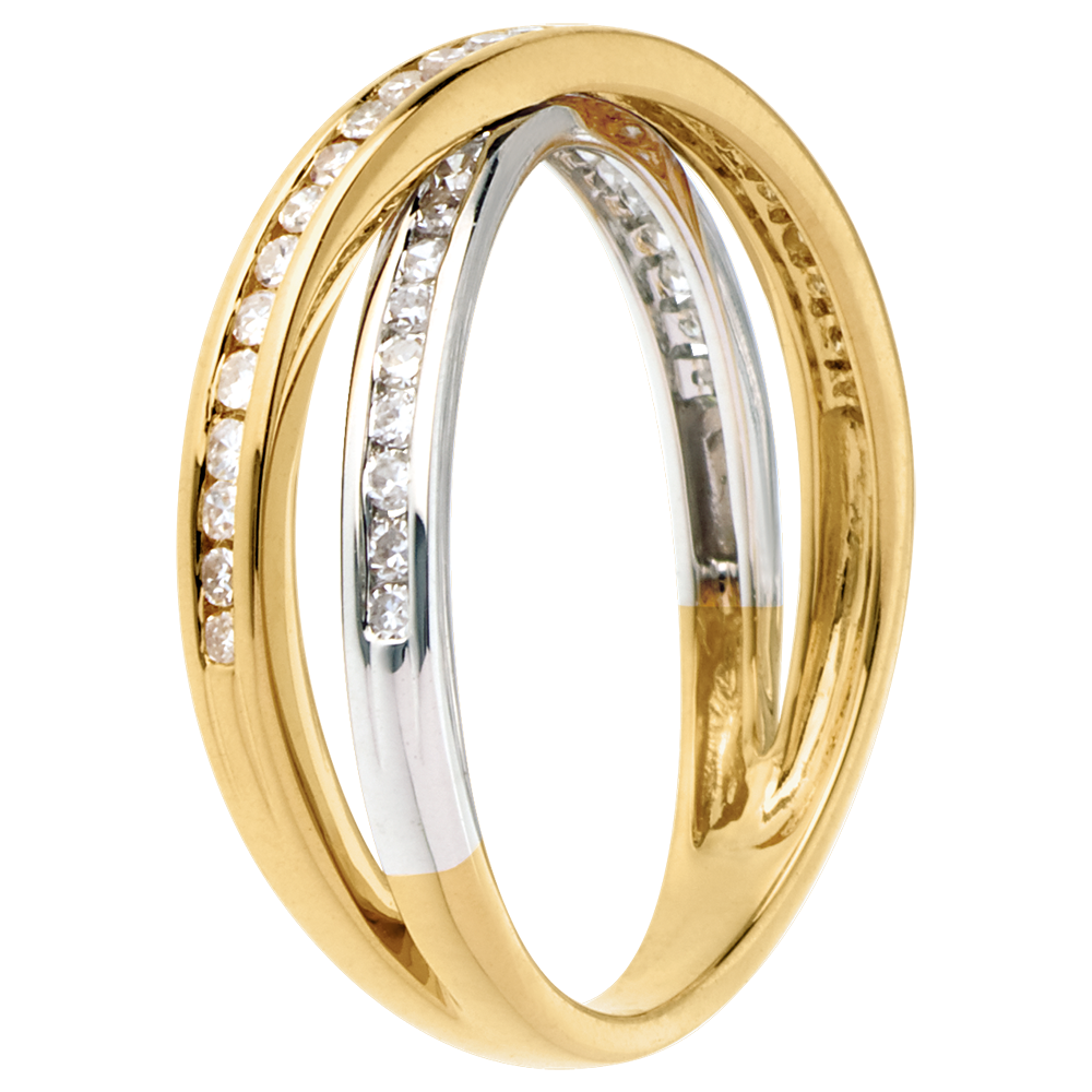 Een tandem ellipsen in geel en witgoud geplaveid met diamanten voor een perfecte harmonie.