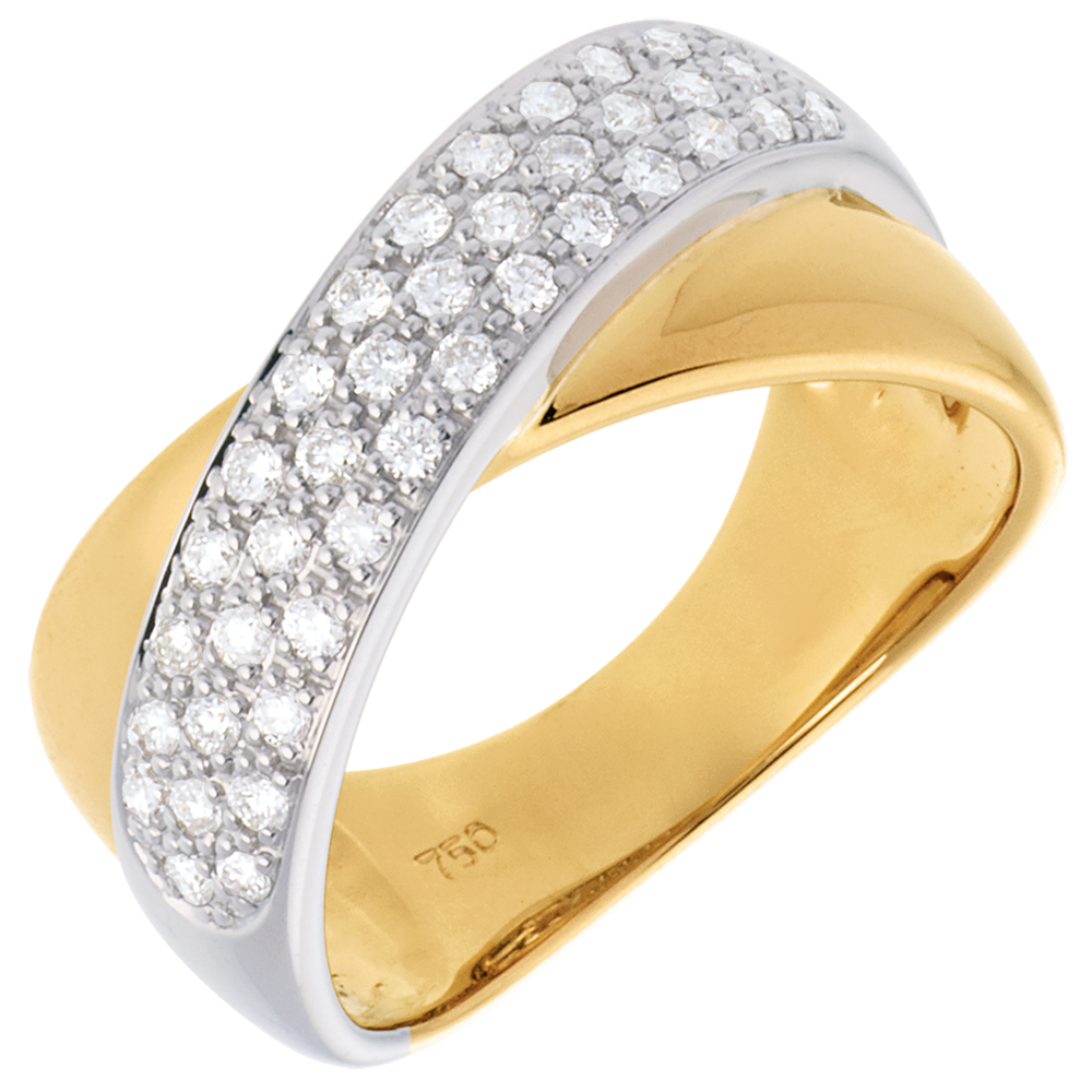 Een tandem ellipsen in geel en witgoud geplaveid met diamanten voor een perfecte harmonie.