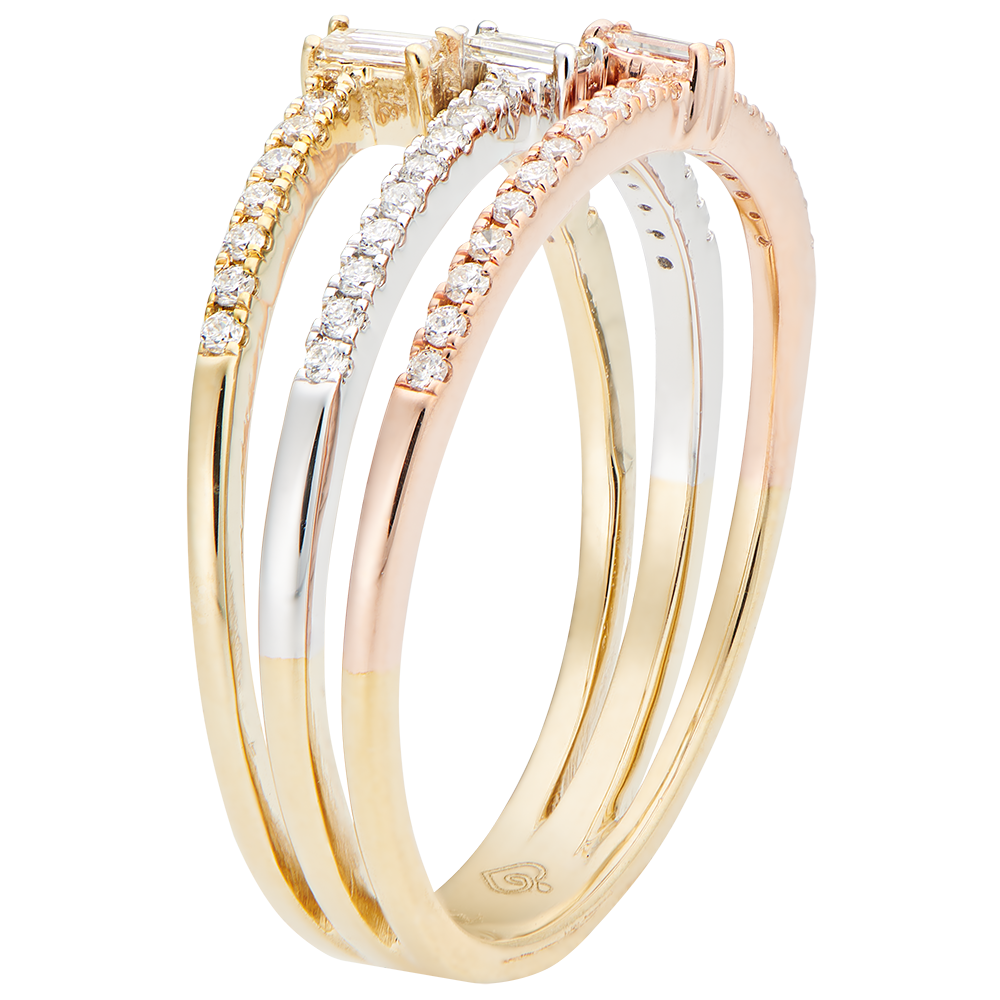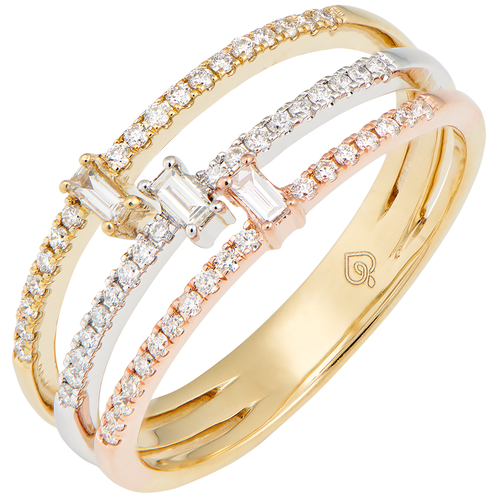 Een ring die verfijnd de 3 goudkleuren combineert onder 3 bezette ringen met een langwerpige diamant.