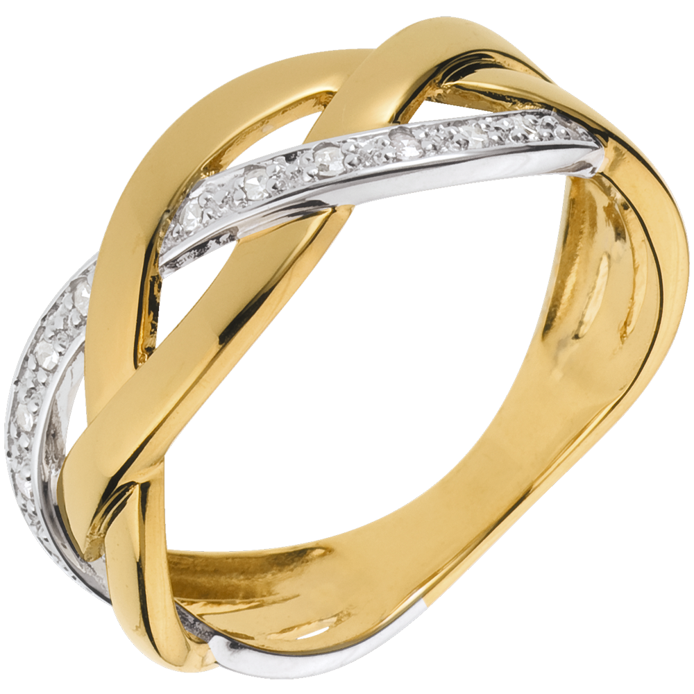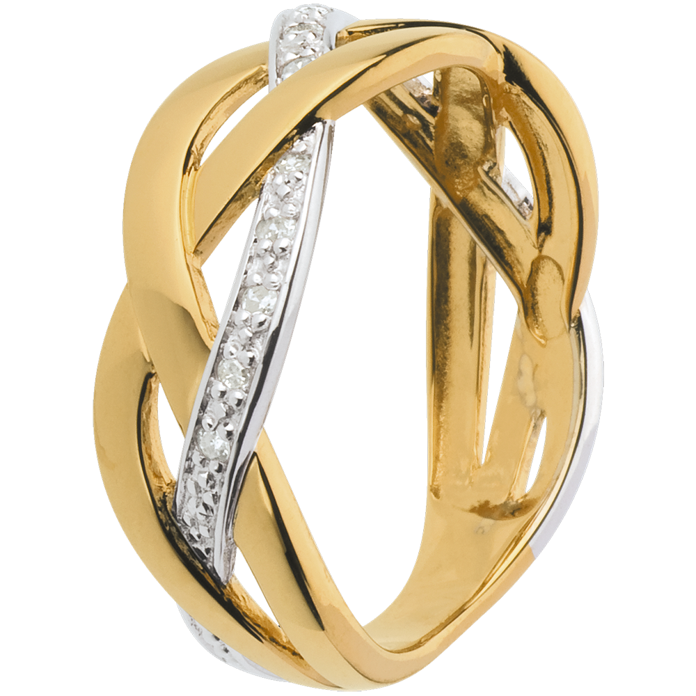 Een gevlochten ring in geel en witgoud, ondertekend met een rij van diamanten