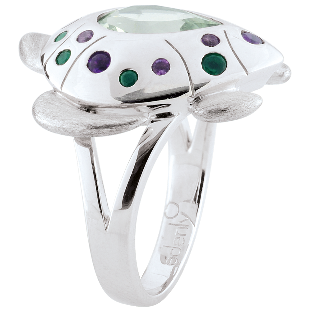 In het midden schittert een groene amethist van Very Good kwaliteit, omringd door paarse amethisten en groene agaat die diepte en glans aan deze unieke ring geven.