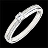 Een solitairee diamant op een asymmetrisch frame met diamanten voor elegantie en subtiele originaliteit.
