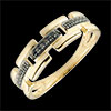 Twee gouden stippellijnen worden gescheiden door stippellijnen met zwarte diamanten. Een moderne en vrouwelijke ring.
