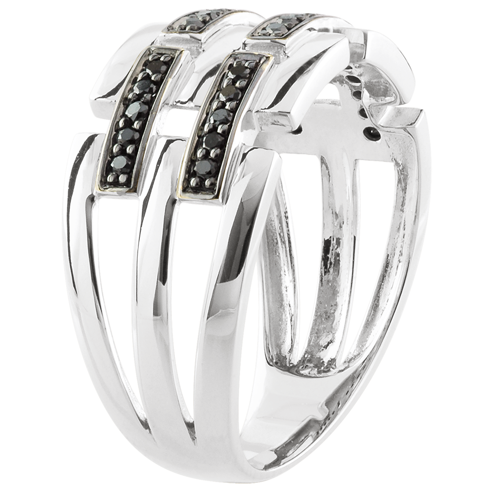Drie gouden stippellijnen worden gescheiden door stippellijnen met zwarte diamanten. Een moderne en vrouwelijke ring.