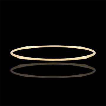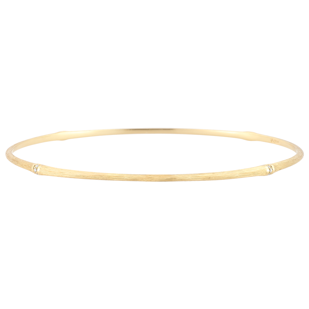 Een soepele en solide bamboetak geeft nu vorm aan een armband van geborsteld geelgoud, met diamanten bezet, voor een eeuwigdurend band. De met de hand uitgevoerde matte afwerking geeft een natuurlijke uitstraling aan deze realistische uitvoering.