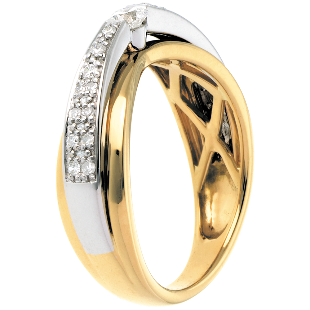 Een dubbele ring geelgoud-witgoud, verfraaid met een pavézetting voor de revelatie van een centrale diamant.