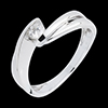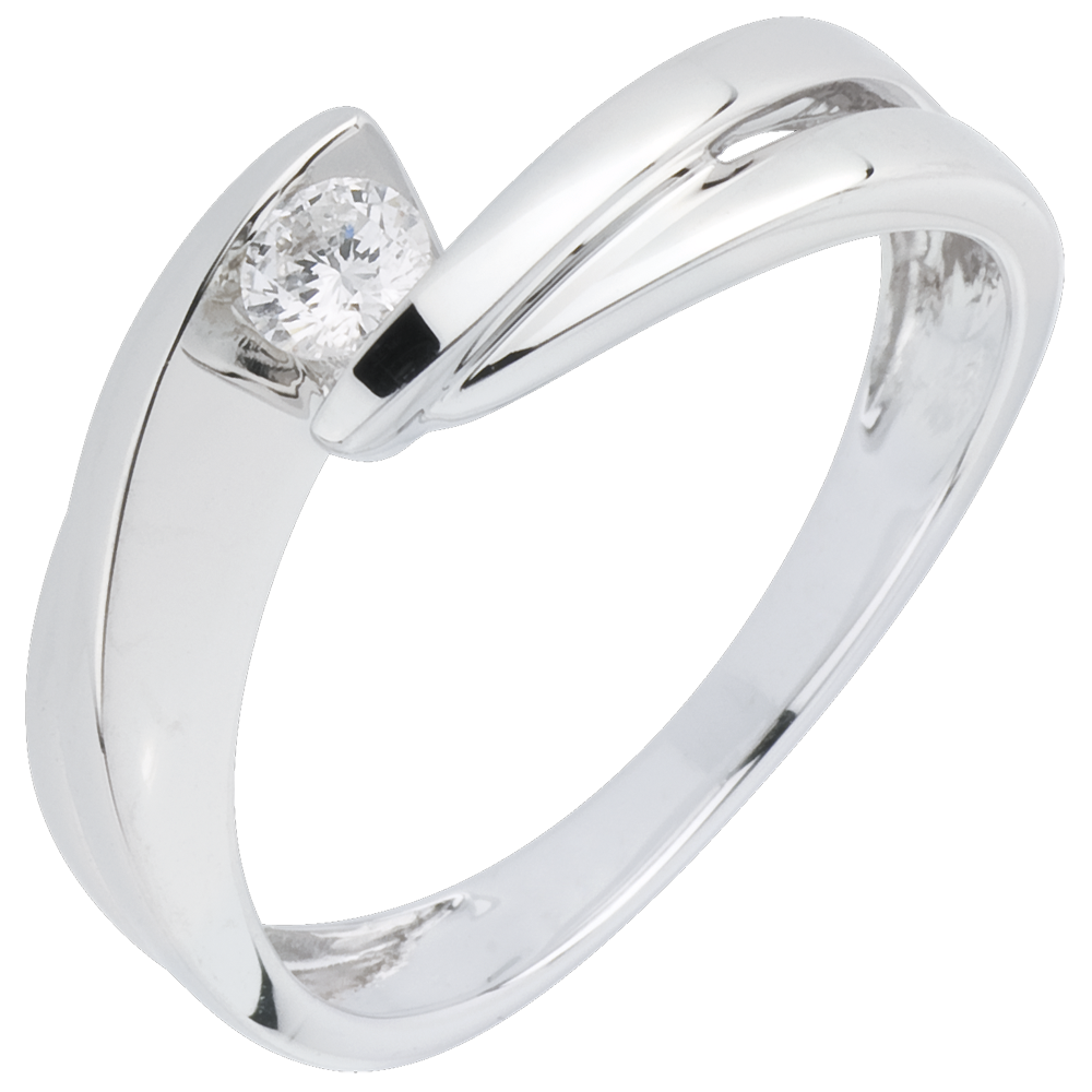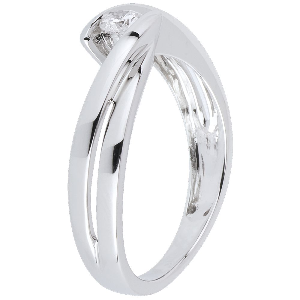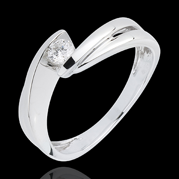 Het witte goud wervelt naar elkaar toe en culmineren in een diamanten solitaire.