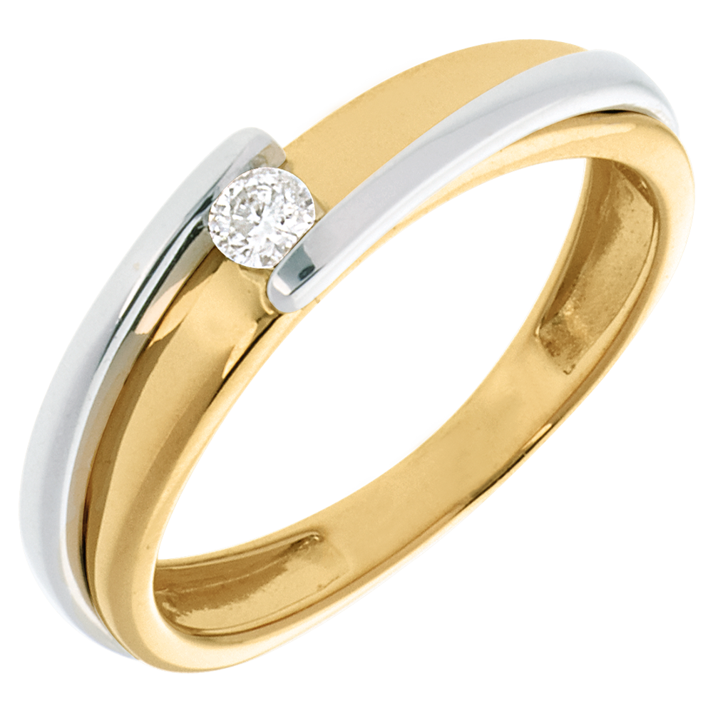 Een eenvoudig en klassiek frame verbonden met de kracht van een geel en witgouden legering, om de delicatesse te benadrukken met een diamantcentrum.