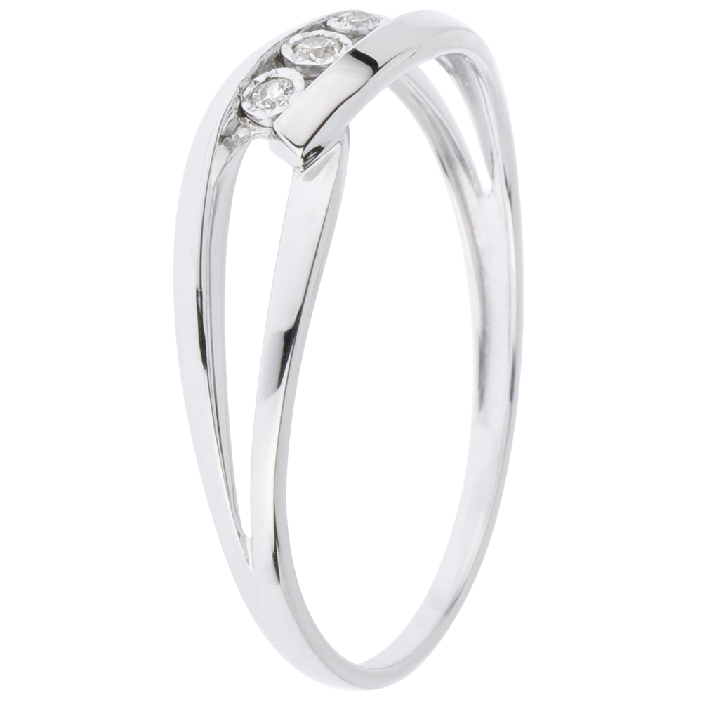 Drie diamanten omringd door witgoud, in een lichte beweging omarmd door hun frame.