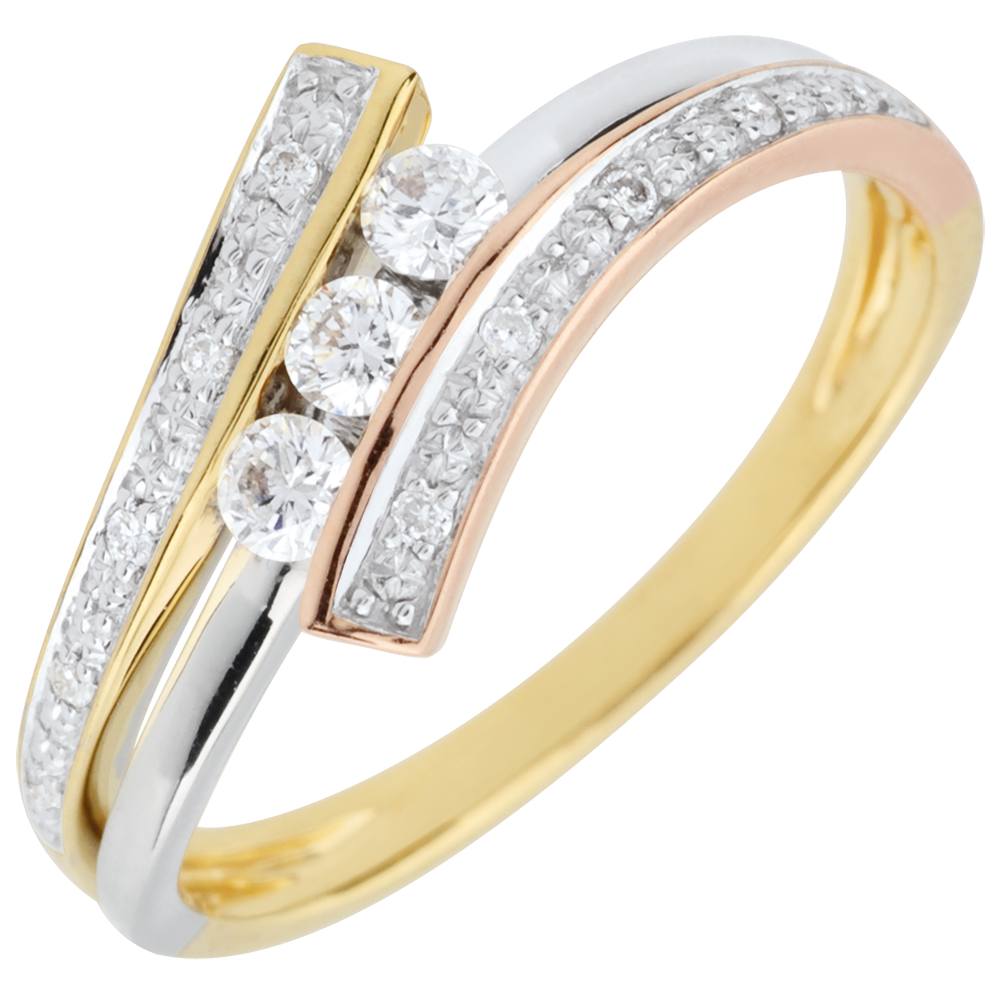 De ring is gemaakt van driekleurig 9 karaat goud en bezet met 13 HSI diamanten met een totaal van 0,196 karaat.