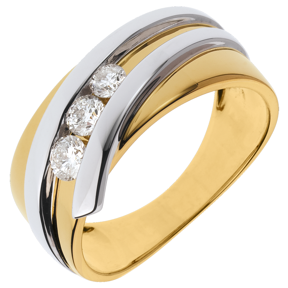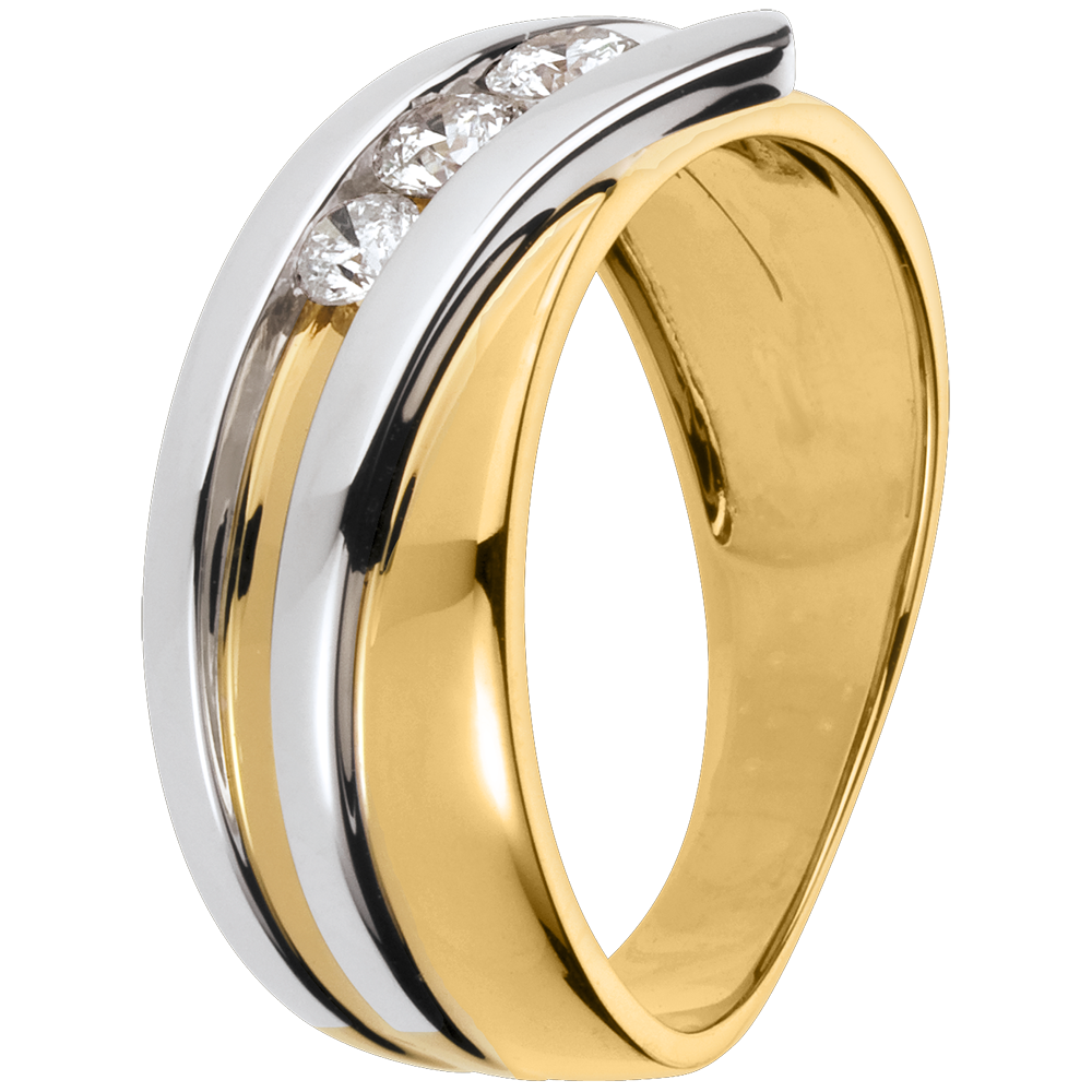 De eenvoud van een geelgouden ring gevlochten op een witgouden ring vertoont een diamanten trilogie.