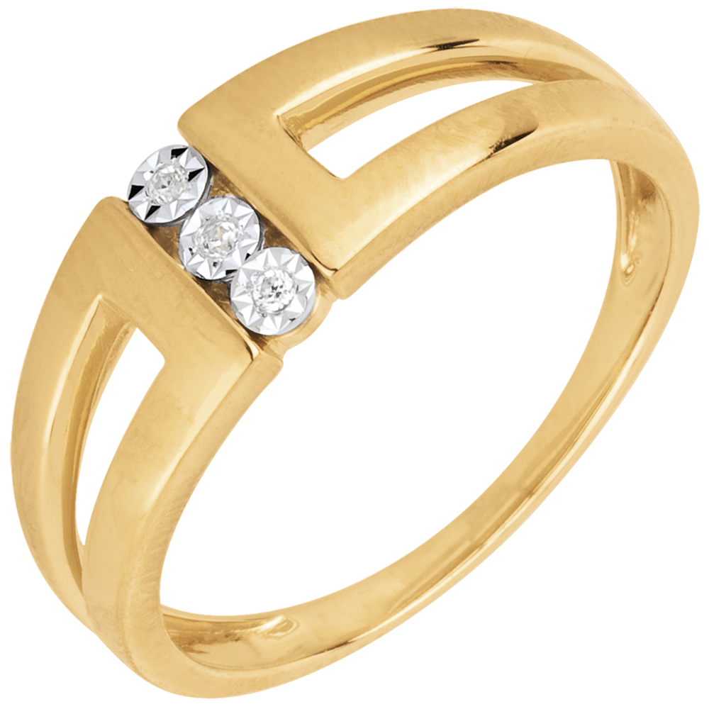 Een trilogie diamanten tussen de evenwijdige lijnen van een geelgouden, ultra modern frame.