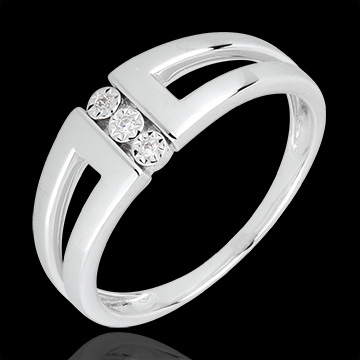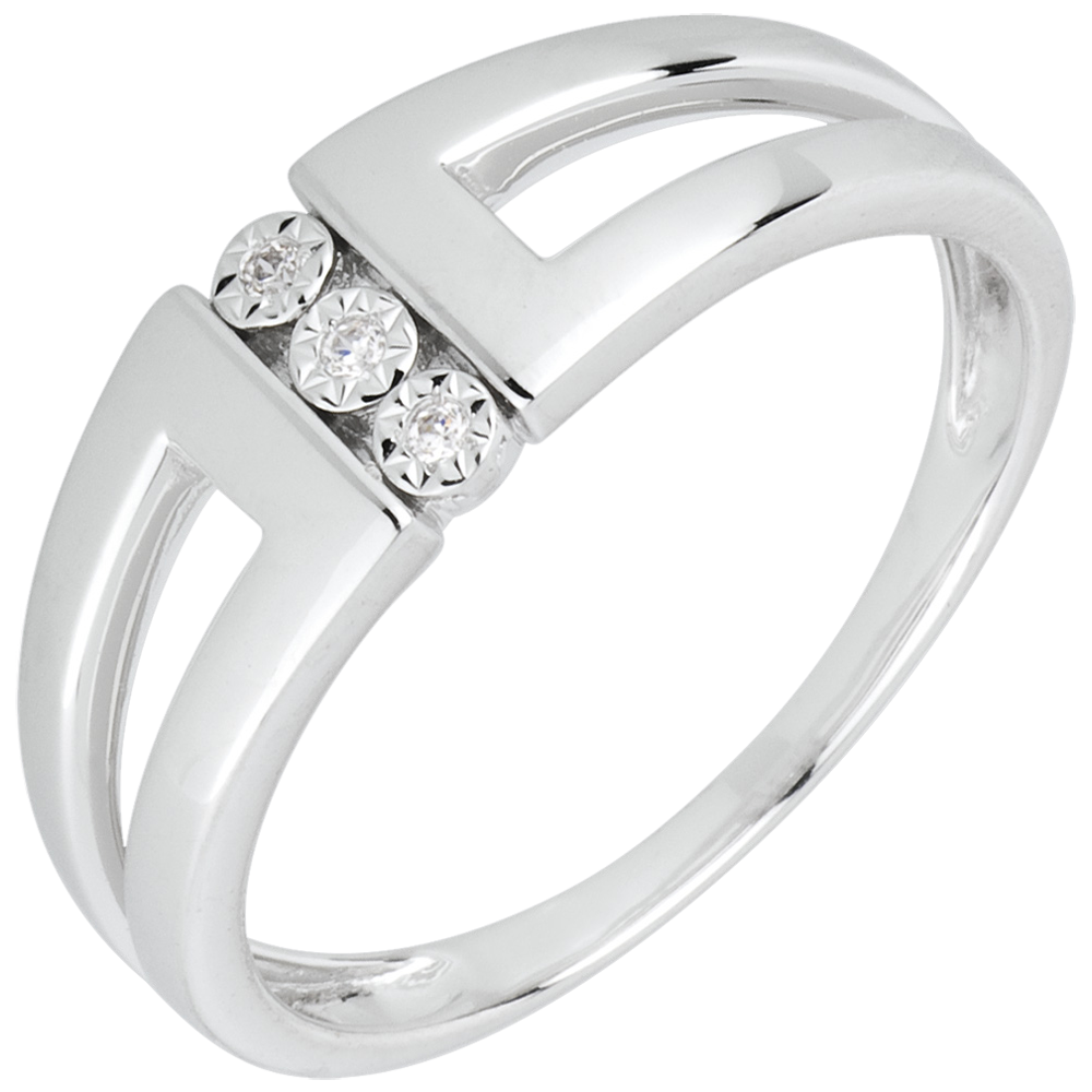 Een trilogie diamanten tussen de evenwijdige lijnen van een witgouden, ultra modern frame.
