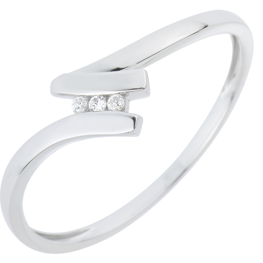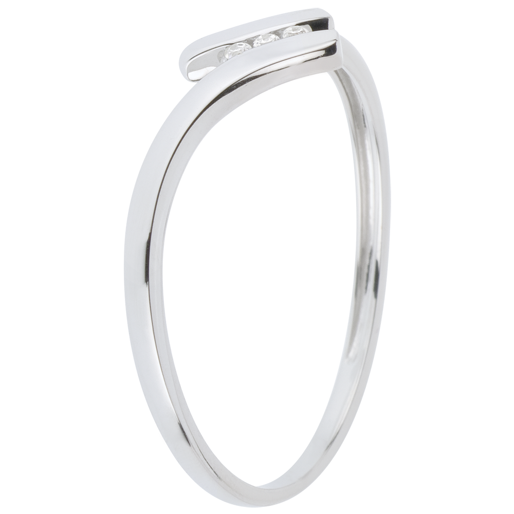 Drie diamanten door witgoud omgeven in een lichte beweging omarmd door hun frame.